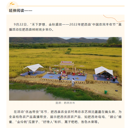 在2022年豐收節(jié)到來之際,通過開展“中國農(nóng)民豐收節(jié)”直播活動,將肥西縣域特色的農(nóng)產(chǎn)品和鄉(xiāng)村新風貌展現(xiàn)至群眾面前,發(fā)揮活動的杠桿作用,激發(fā)了群眾對農(nóng)產(chǎn)品消費購買的熱情以及促進肥西旅游市場的消費。此次活動共6.9萬人次參與觀看線上直播,在直播中過程中展示了肥西優(yōu)質(zhì)農(nóng)產(chǎn)品肥西老母雞、“顧公”蜂蜜、“金伶俐”瓜蔞子“好饞人”粉折、蒿子粑粑、各色水果以及美麗鄉(xiāng)村新容貌。不僅如此,該活動還受到了國家級媒體、省市縣媒體的廣泛關(guān)注,如新華網(wǎng)、中國新聞網(wǎng)安徽、合肥日報、肥西發(fā)布等媒體的紛紛報道。進一步展現(xiàn)了肥西特色農(nóng)業(yè)及美麗鄉(xiāng)村新形象。